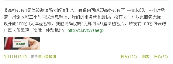 在微博上知道有福網(wǎng)推出了商務名片系統(tǒng)。推廣期間,一元一盒名片,白菜價格,相當激動,參與活動后就馬上獲得了體驗碼。當天1點就下單了,4點居然有專門的人送來公司,速度相當給力?。?/p>