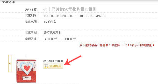 3、上傳照片后放入購物車,在優(yōu)惠活動中選擇立刻購買(如下圖),即可5元得相冊!