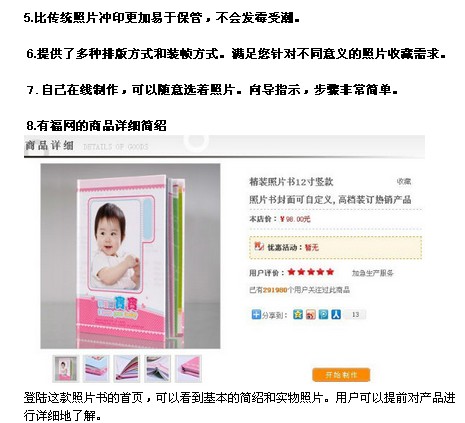 照片書搶購,我非常的高興,寶寶的那些美麗的瞬間就可以永遠(yuǎn)保留下來了。在對有福網(wǎng)照片書總體了解下,覺得很不錯(cuò)。“這款照片書尺寸夠大,樣式大方美麗,是我心儀已久的產(chǎn)品,寶寶成長的每一個(gè)月我都用相機(jī)記錄下來了,希望能有試用的機(jī)會(huì),把寶貝可愛的照片做出來呢,留一份美好的記憶。”