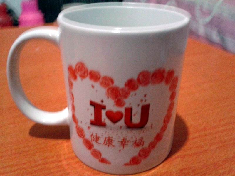 杯子一面是心形玫瑰花,中間是I LOVE YOU ,下面我給編輯了健康幸福的字樣,這些都可以DIY的。