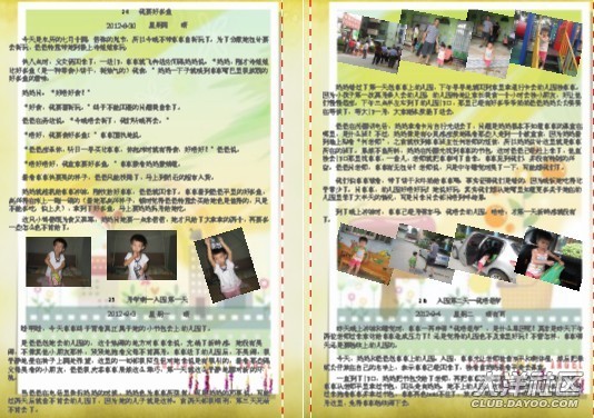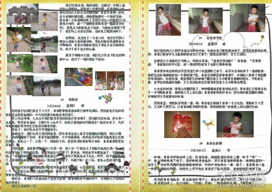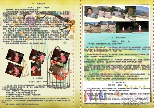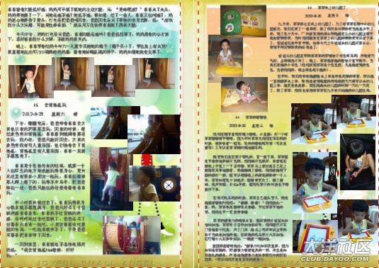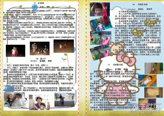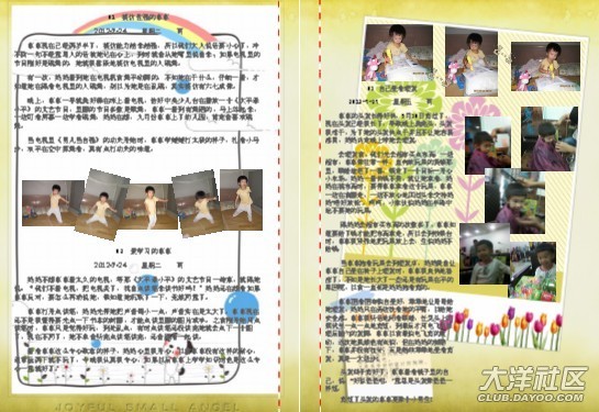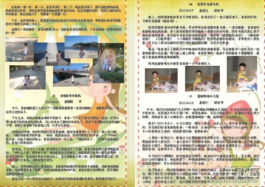 一開(kāi)始做時(shí),媽媽幾乎是一頁(yè)一篇日記,在做了10頁(yè)后,媽媽發(fā)現(xiàn)其實(shí)可以把內(nèi)容安排得更緊密些,只要把相片弄小一些,那樣就可以放更多的日記進(jìn)去。這時(shí)另外一個(gè)想法躍入腦海里,不如找些可愛(ài)的圖片做背景??墒且业胶每吹膱D片并不容易,媽媽花了很多時(shí)間去找圖片。
