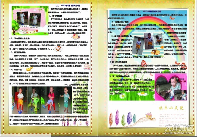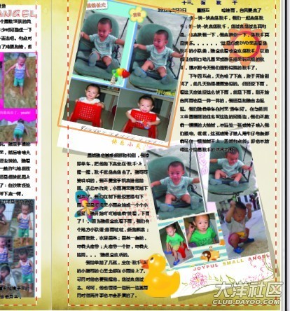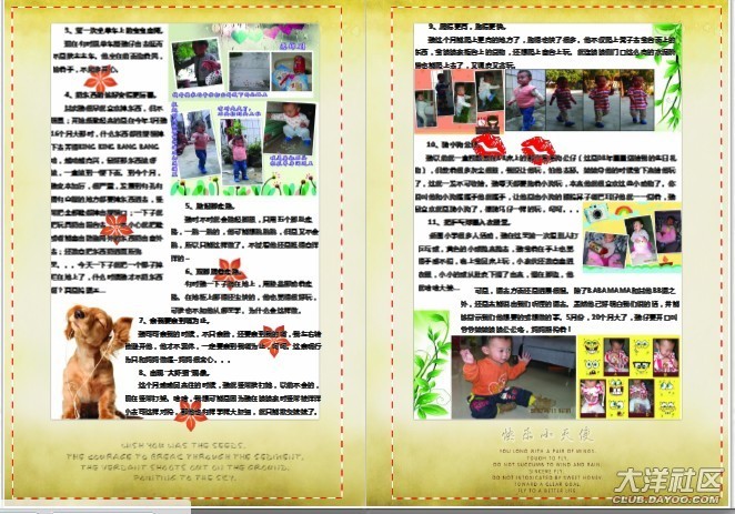 完成照片問題,沒弄明白菲媽說的加陰影和線條,讓相片立體一些,那算了,就不加了。當我放日記內(nèi)容的時候,經(jīng)常遇到“文字區(qū)域顯示不完全”的問題。調(diào)整調(diào)整再調(diào)整。最后在第五頁的標題欄,怎么也弄不到,因為提示“文字區(qū)域顯示不完全”這一欄剛好擋住我的標題,沒法移出來調(diào)整。我只是在原來的標題上加了序號字“五”和改成藍色和黑體,只顯示不出“五、”,所以就算了沒有重新弄過這一頁。