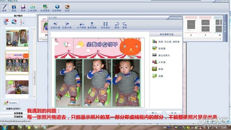 由于自己不會弄,本以為按照菲媽寫的步驟完全按照她的來做,但她怎么能一頁里面放那么多圖片,而我的只放一張進去也顯示不了整張照片?當時請教菲媽,一直沒發(fā)現(xiàn)她給我的消息留了她Q號說在QQ里詳細聊才說得清楚(最近幾天才在看到這消息),而我又沒多少時間上網(wǎng),所以真不好意思呀菲媽。而她說的在文字框里插入,我也沒弄明白是怎么插入。跟有福網(wǎng)客服磨了半天,客服說來說去都說是我的照片問題,而且她們的回答也不是即時的,要等,所以我也不跟她們耗時間了,靠自己吧。