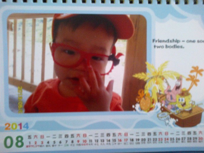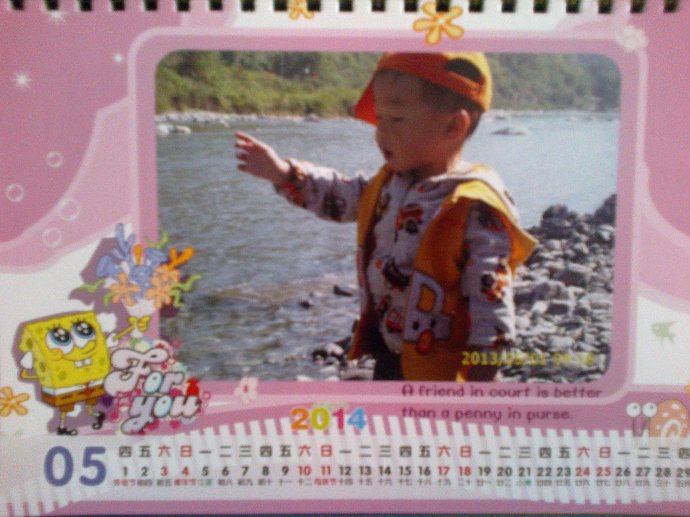我制作這本臺歷時,在選模版的問題上糾結(jié)了好半天拿不定主意,因?yàn)槎继每戳耍谑俏覍⒆约鹤罱K選好的兩個模版都制作了一遍。將先前挑選好的照片上傳、簡單的修飾、保存在我的作品欄里。決定等兒子午睡醒后,讓他自己來選一個,他毫不猶豫地選了《海綿寶寶》這個模版,理由是:和我書包上海綿寶寶一模一樣,我好喜歡海綿寶寶呀!