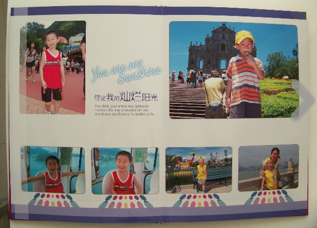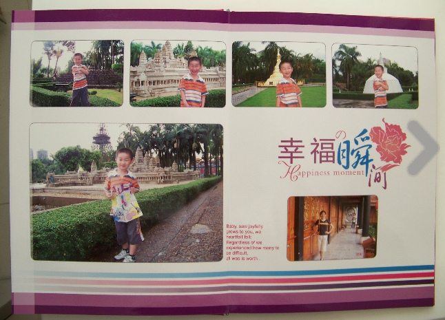 隨著寶寶的長大,也一直都有給寶寶照相留念,因?yàn)楝F(xiàn)在都是用數(shù)碼相機(jī)嘛,把相片都存在了電腦里,沒把相片曬出來。前段時間家里的電腦硬盤壞了,無法打開,哎,所有的東西都一去不復(fù)返了,真是太可惜了。今年暑假有幸,老公帶兒子去了趟港澳游,我去了云南,回來后一直在琢磨怎么能把這美好的時光給好好保存下來,想到了做成一個相冊。在上網(wǎng)的時候無意中在些論壇里看到有人介紹說“有福網(wǎng)”(http://m.bridgetiger.com/?u=508381)做的照片書不錯,我?guī)е闷娴男倪M(jìn)入了網(wǎng)站,選了“畫冊/照片書”,再選了“影樓裝豎式畫冊12X8英寸”,然后預(yù)覽模板,感覺還不錯,價格也不是很貴,于是決定做一本試試,心里想著要是好以后再多做。接著我下載了官網(wǎng)的“有福藝術(shù)家”軟件,在自己的電腦里開始制作照片書。我是在8月9日下午6點(diǎn)多下的定單,今天(8月12日)就收到了,想不到速度這么快,我還以為會等上七八天呢。一看封面給我的感覺是驚喜,比我想象的要好,印刷得非常清晰,色彩也很豐富到位,與我在制作時電腦里的效果差不多,老公看了也挺滿意的,我倆商量著,準(zhǔn)備再做一本。想做照片書的朋友不防也去試一試,相信不會讓朋友們失望的。現(xiàn)在附上幾張我的照片書的實(shí)物圖。