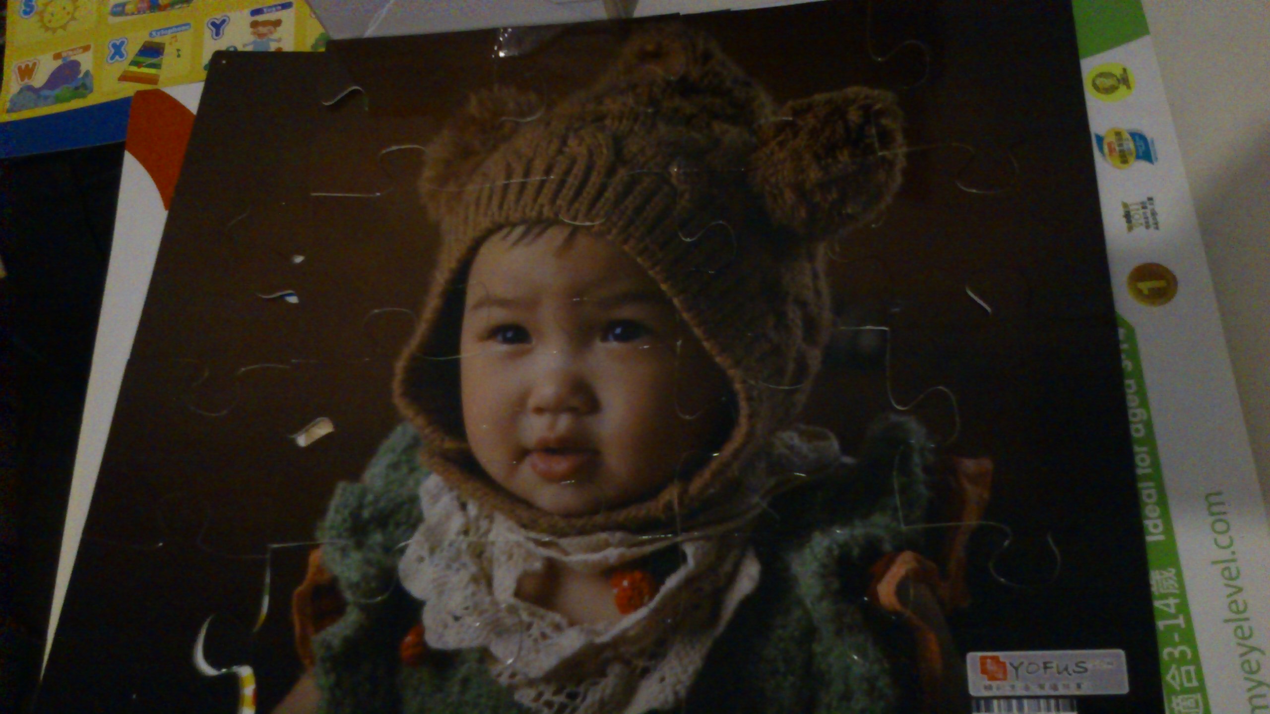 這么有趣的照片,單一張有點(diǎn)簡單了。最近在有福網(wǎng)上發(fā)現(xiàn)更加有趣的東西,就是個(gè)性拼圖,二十塊小小的木塊,能拼出這Q孩子模樣。給她自己玩,也是件有趣事情。媽媽還拼好,裱起來,她在旁邊還搗亂。裱好拼圖時(shí)候,放在她面前,她那天生呆萌表情又出來。