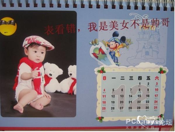 還真的沒有給菲兒寶貝做過這種可愛的小東西,時(shí)間有限接觸的也少,這是一個(gè)相當(dāng)好的時(shí)機(jī),可以為這個(gè)可人兒做一本了。 下載了臺(tái)歷制作軟件,選擇了一個(gè)迪士尼的臺(tái)歷模板,上面有菲兒很喜歡的米老鼠,而且可愛的造型也深得我心。接下來就是上傳照片了,開始怎么也不行,郁悶死人了,速度也跟蝸牛有得一拼。最后只能把熟睡中的菲兒他爸給挖起來,他說不行就重新下載安裝過再試啊。就刪了先前的重新下載了一個(gè),這次真的很快了。照片填充完后,看到上面還有頁面修飾的,就想把漂亮的圖案都留給菲兒,因?yàn)樨澏喾炊漠嬅婧芑?,后面都只用了一點(diǎn)點(diǎn)小裝飾,也寫上了一些媽媽對(duì)寶貝說的話,背面日期上重要的梯子也做了特別的說明,好方便的,這樣就不會(huì)把大家的生日忘記了。 邊看邊修改,不滿意的就換照片,弄完已經(jīng)是凌晨3點(diǎn)多了。最近都沒睡好過,頭疼的很。不過即便這樣躺在床上還是很高興,但是菲兒睡覺喜歡踢被子,這宿感覺沒睡就天亮了。 3天后菲兒爸就帶回來一包裹,接過來就知道我的東西到了,硬紙殼的包裝盒避免了運(yùn)輸途中的擠壓和磨碎,有福還真是有心。打開包裹時(shí)菲兒也過來湊了一腳,咱三口子看著這個(gè)臺(tái)歷開心的不得了,菲兒還來想上去抓自己!翻開里面也沒有難聞的氣味,給菲兒拿著也放心。每一頁的印刷都非常的漂亮,銅版紙的質(zhì)感很好,不像一般的薄,這個(gè)要厚實(shí)些。 隔天就拿著東西和菲兒去姥姥家顯擺來了,相當(dāng)受歡迎的,圍觀指數(shù)不是一般的