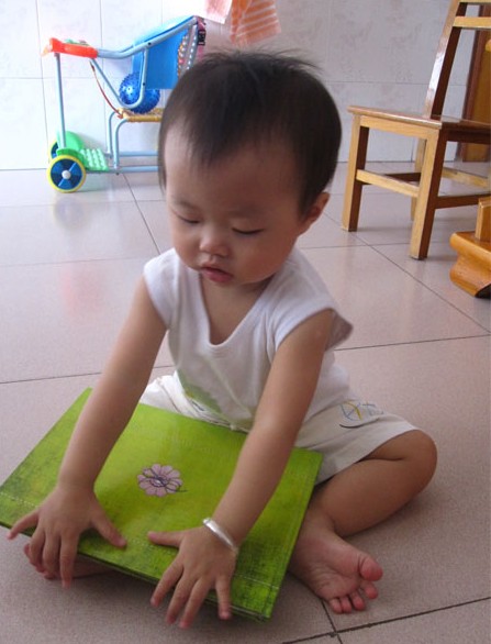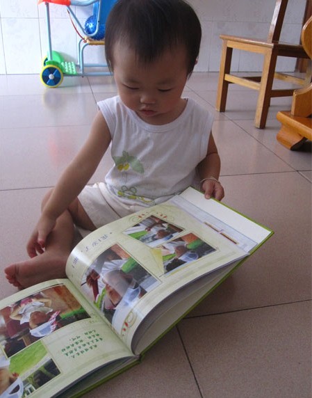 小家伙一邊看照片一邊笑呢,看完一頁也會自己翻開看下一頁,有時候還指著自己的相片在那自得其樂呢,看來小寶寶的世界也很精彩的。