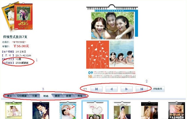 進(jìn)入之后,可以看到此類掛歷的介紹,1區(qū)域包括裝訂方式以及紙張,原來我做過印刷所以我知道250G銅版紙可是相當(dāng)厚的喲。